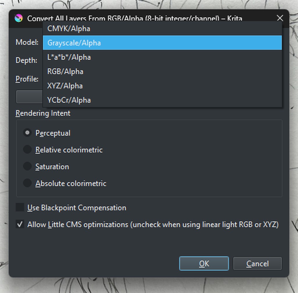 Now select "Grayscale/Alpha" from the "Model:" drop-down. Press ok to convert the image. You should now see the image in grayscale in the Krita canvas.