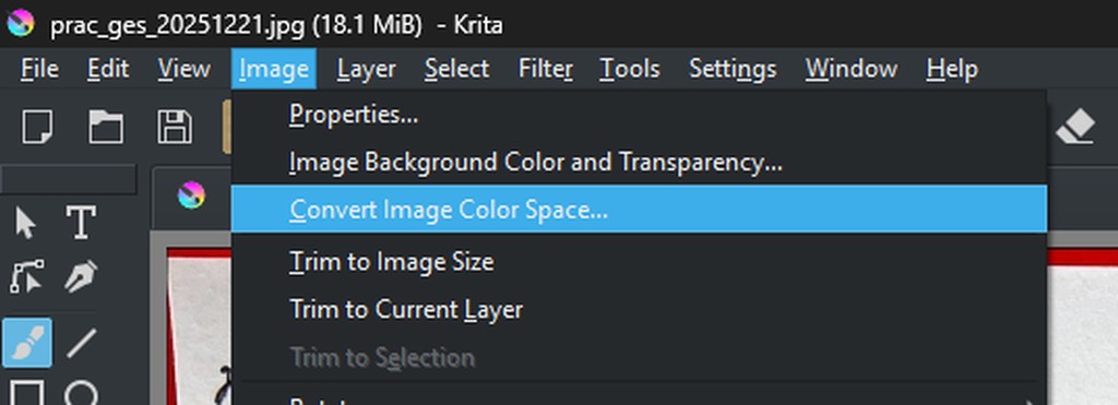 The first step is to convert our image to grayscale. We will use Krita's Color Space dialog.