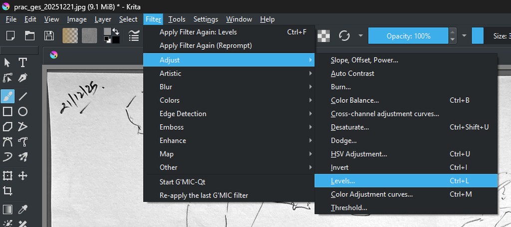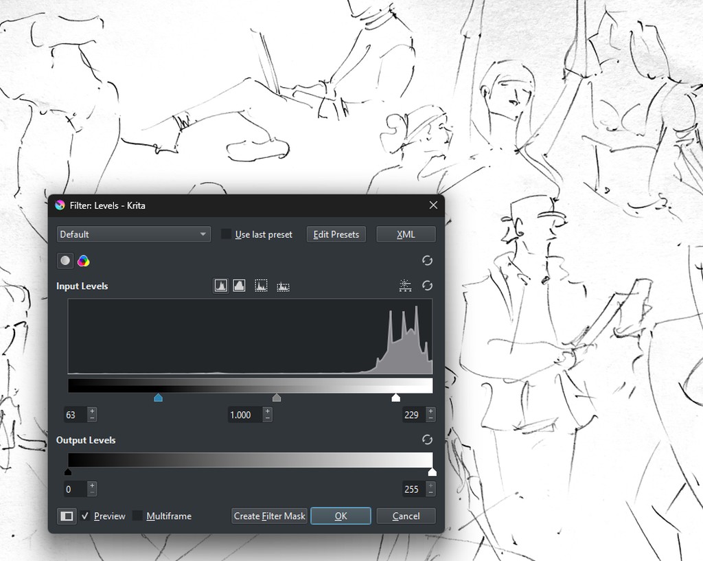 The second important step is to cleanup the lines, dust and contrast of the scan. We use Krita's "Levels" dialog to make the adjustments.